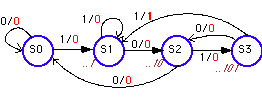 Figure 1: State diagram, describing the sequence detector ("1011") implemented as a Mealy machine. The number in italics underneath the states indicate which part of the sequence the state remembers.