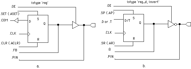 One can specify more than one pin per line: You do not need to specify the pin. Pin numbers can be specified later by using a "user constraint file " when doing the compilation using Xilinx CAD. This has the advantage that our design is more general and flexible. The ! indicates an active low (the signal will be inverted). The istype is an optional attribute assignment for a pin such as 'com' to indicate that the output is a combinational signal or 'reg' for a clocked signal (registered with a flip flop). This attribute is only for output pins.