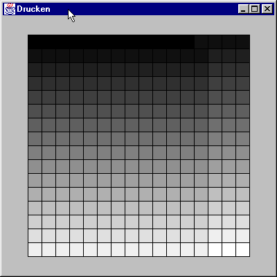 Das nachfolgende Listing kombiniert beide Varianten und zeigt den Ausdruck einer Testseite. Das Programm erstellt ein Hauptfenster und ruft zwei Sekunden später die Methode printTestPage zur Druckausgabe auf. Darin wird zunächst ein PrintJob erzeugt und dann gemäß dem oben beschriebenen Verfahren die Ausgabegröße ermittelt. Anschließend wird der Grafikkontext beschafft und ein Rahmen, einige Textzeilen mit Angaben zu den Metriken und eine Graustufenmatrix ausgegeben. Nach Ende der Druckausgabe wird die Seite mit dispose ausgegeben und der Druckjob mit end geschlossen. Der Code für die Darstellung der Graustufenmatrix wurde in der Methode paintGrayBoxes implementiert und wird von der Bildschirm- und Druckausgabe gemeinsam verwendet: