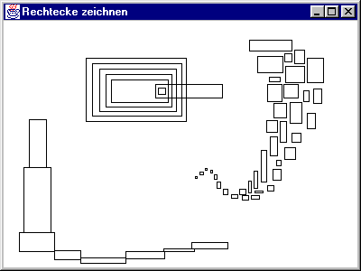 Interessant ist hier das Zusammenspiel zwischen paint und den Methoden, die die Maus-Events behandeln. Beim Aufruf von paint werden zunächst alle Rechtecke gezeichnet, die sich in der Liste drawlist befinden. Anschließend überprüft paint, ob das aktuelle Element (dieses wurde beim Mausklick angelegt) eine Länge oder Breite größer Null hat, und zeichnet es gegebenenfalls. Dies ist genau dann der Fall, wenn der Anwender die Maustaste gedrückt und die Maus vom Ursprung nach rechts unten bewegt hat. Beim Loslassen der Maustaste wird das aktuelle Element in die Liste der Rechtecke eingetragen und steht so beim nächsten paint zur Verfügung. |