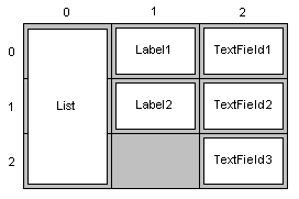 Das folgende Beispiel zeigt einen Dialog, der ein GridLayout der Größe 1*2 Elemente verwendet. Innerhalb des ersten Elements wird ein Panel mit einem GridLayout der Größe 3*1 Elemente verwendet, innerhalb des zweiten Elements ein BorderLayout: