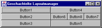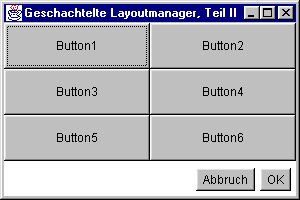 Eines der Schlüsselkonzepte zur Realisierung komplexer, portabler Dialoge ist die Fähigkeit, Layoutmanager schachteln zu können. Dazu wird an der Stelle, die ein Sublayout erhalten soll, einfach ein Objekt der Klasse Panel eingefügt, das einen eigenen Layoutmanager erhält. Dieses Panel kann mit Dialogelementen bestückt werden, die entsprechend dem zugeordneten Unterlayout formatiert werden.